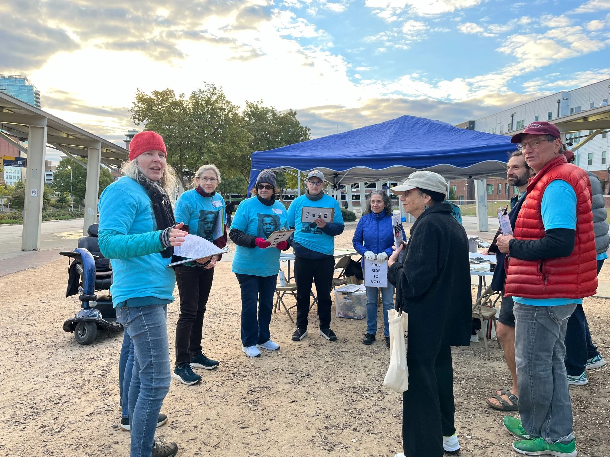 Bus Station: Based at the downtown Durham bus station, we have the opportunity to connect with a wide variety of Durhamites and particularly with people who do not have easeful transportation options for voting. Many bus riders and other folks who spend time in and around the bus station also navigate significant other barriers to voting. As well, they are people whom other canvassing often does not reach. Over the years, we have come to know many of these neighbors.